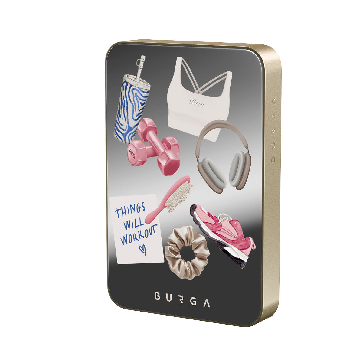 This design features: dumbbells, headphones, tumbler, hairbrush, pink trainers, sports bra, crunchie, "Things Will Work Out" sticky note