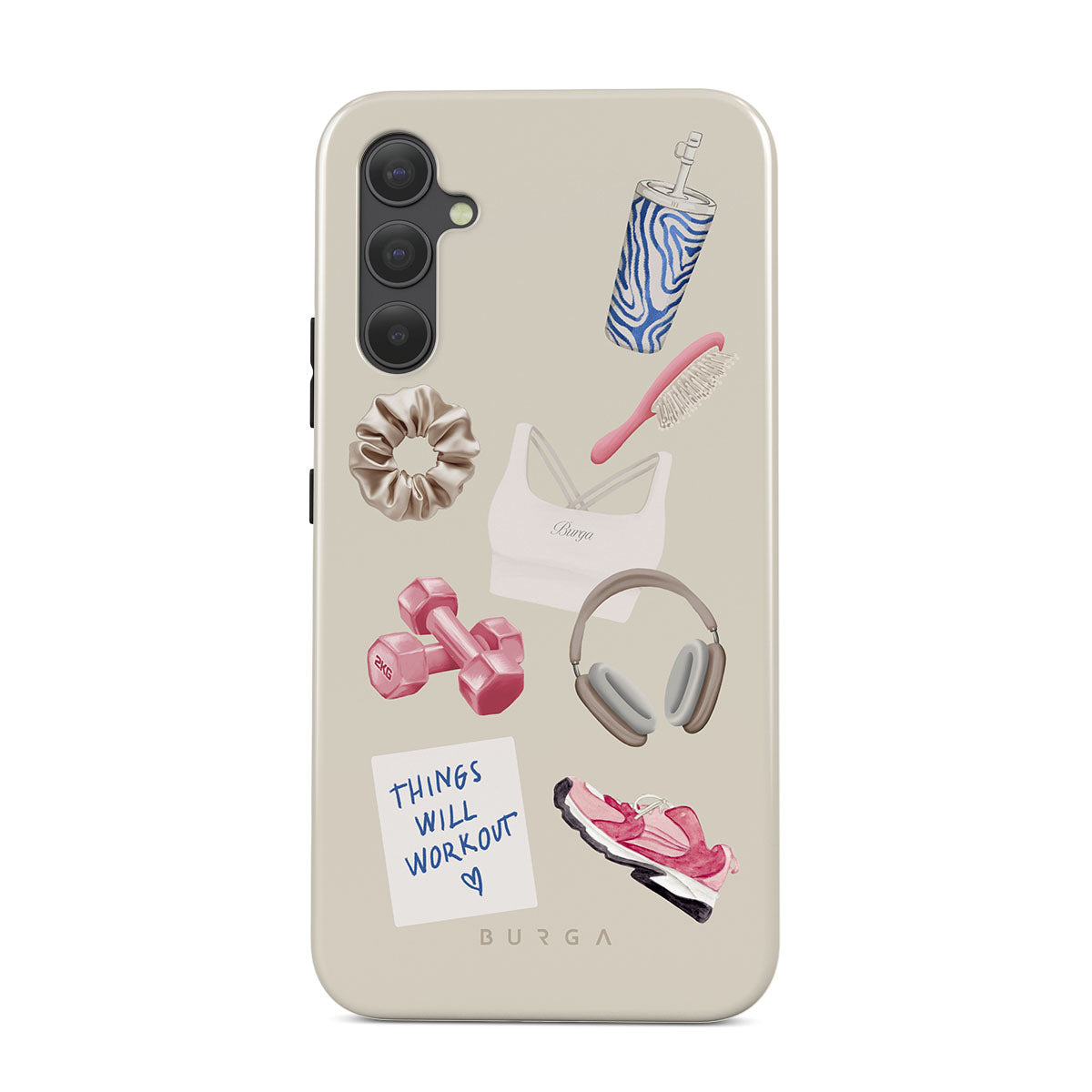 This design features: dumbbells, headphones, tumbler, hairbrush, pink trainers, sports bra, crunchie, "Things Will Work Out" sticky note