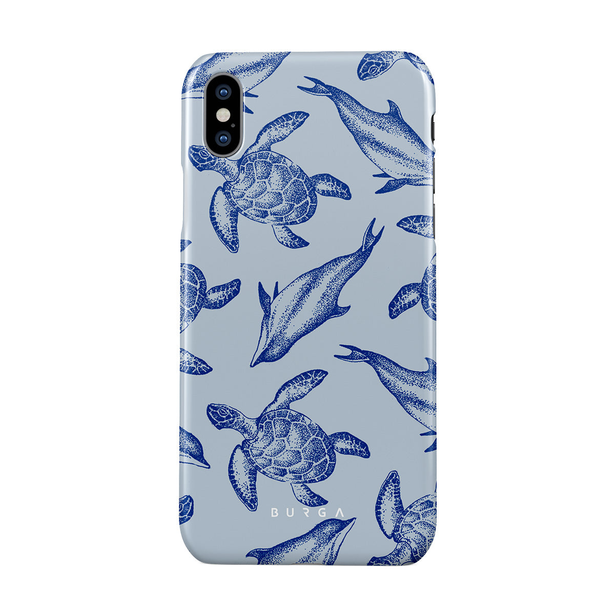 A beautiful design featuring lively turtles and dolphins playfully dancing in serene light blue water. Dive into the ocean's rhythm with our Aquatic Dance iPhone XS Max case.