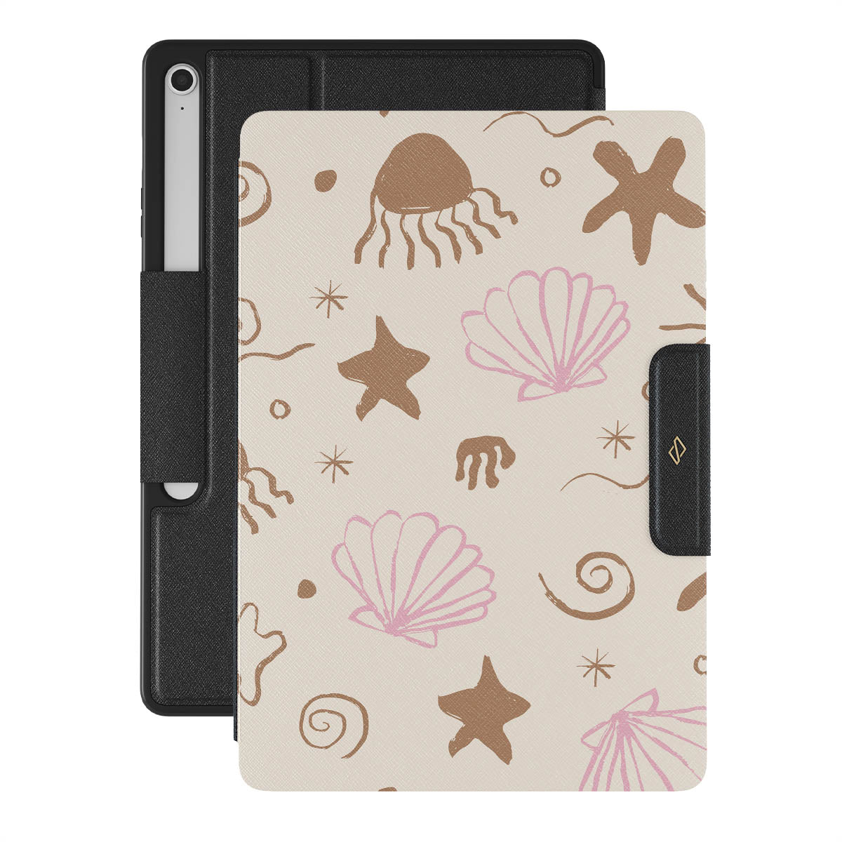 Our Beach Games Samsung Galaxy Tab S10+ FE folio case features a delightful design inspired by seaside treasures, including cute starfish, pink seashells, and playful wave patterns on a sandy background. This beach-themed pattern captures the essence of a fun day at the shore, evoking the joy of discovering beautiful ocean gems.