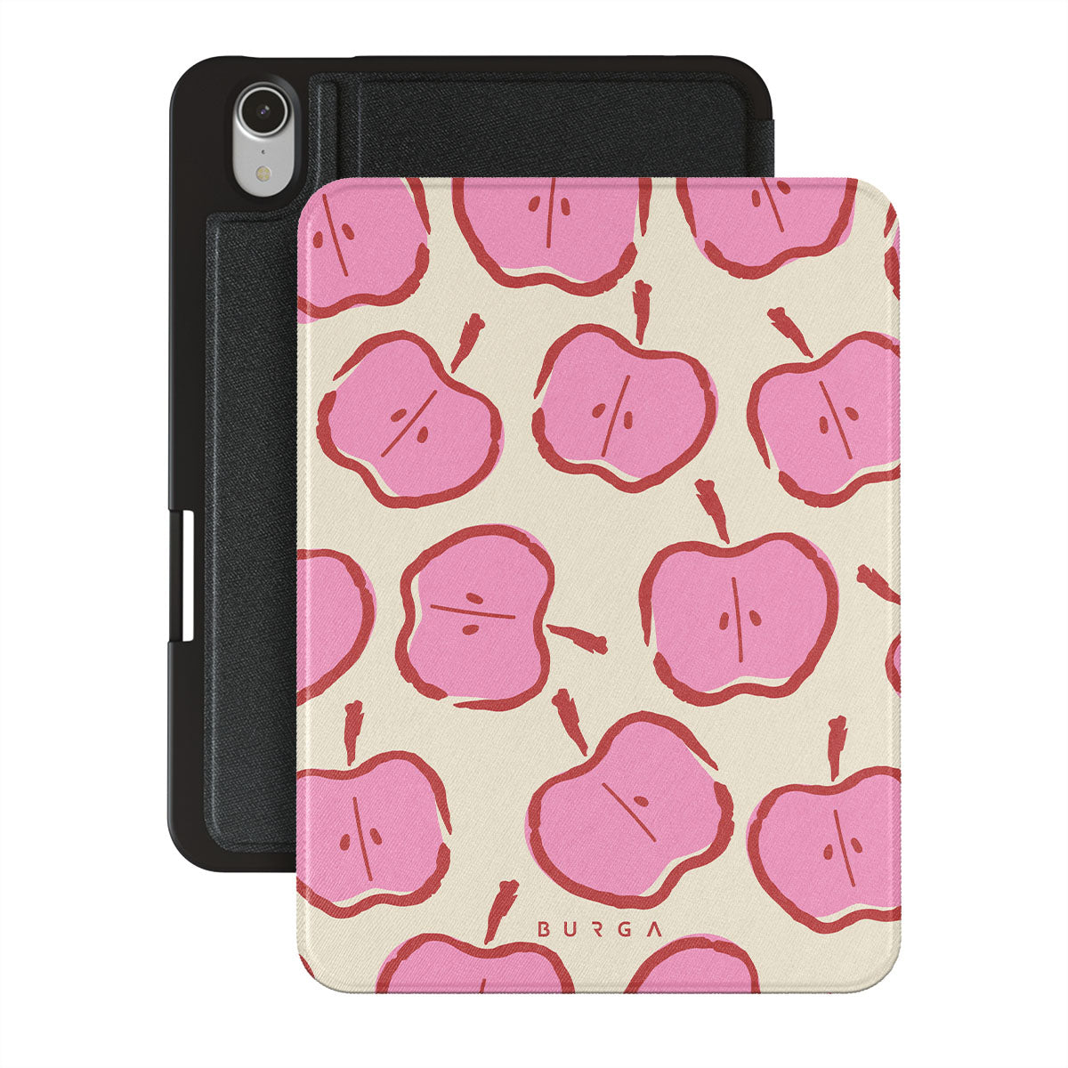 Our Bon Appétit iPad Mini 8.3 (A17 Pro/6th Gen) 2021 folio case design makes every day feel like a magical adventure filled with sweet surprises. The playful pink hues of the apples stand out brilliantly against the serene cream background, creating a captivating and enchanting visual.