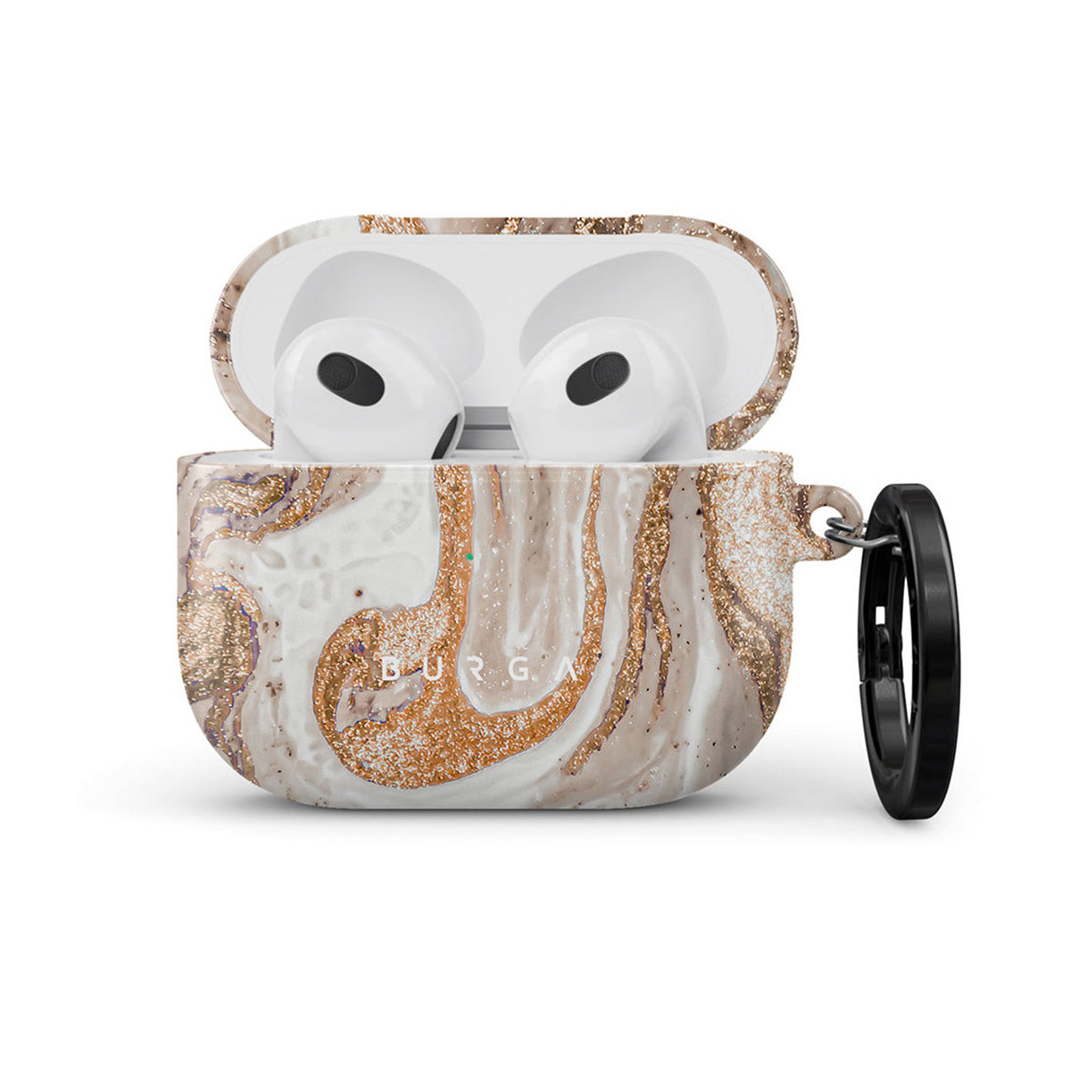 Sophisticated Cappuccino Apple Airpods 3 case cover showcases a soft creamy marble pattern with golden swirls in it. The marble dream radiates elegance and luxury. Add some of it to your wardrobe while keeping your tech accessory pretty and protected. Our case fits perfectly snug around Apple Airpods 3 . “Like a glove!” one might say. And it won’t disrupt the wireless charging capabilities of the newer model. There’s even an LED light indicator to prove it (don’t worry, wired charging still works, too). When fitted, the BURGA case will protect the delicate Apple Airpods 3 case beneath it from scratches, bumps, and drops while remaining scratch-free itself. Our signature design pattern prints are High Quality, and will never peel or fade away- thanks to our unique printing technology. And finally, a handy carabiner is there to make your life easier and more convenient: just snap it around your keys or belt loop and tackle the day head-on. Your music is right there by your side when you need it.