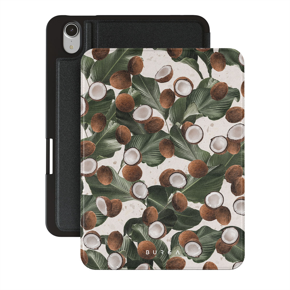 Coconut Crush iPad Mini 8.3 (A17 Pro/6th Gen) 2021 folio case showcases a soft creme color design with a playful addition of coconuts on top. The unexpected design duo will add a touch of tropical playfulness to your style while offering heavy-duty protection for your cell iPad.