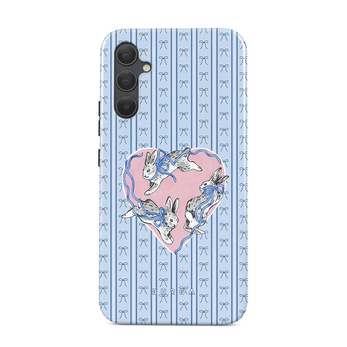 This design features: white rabbits, heart frame, blue stripes