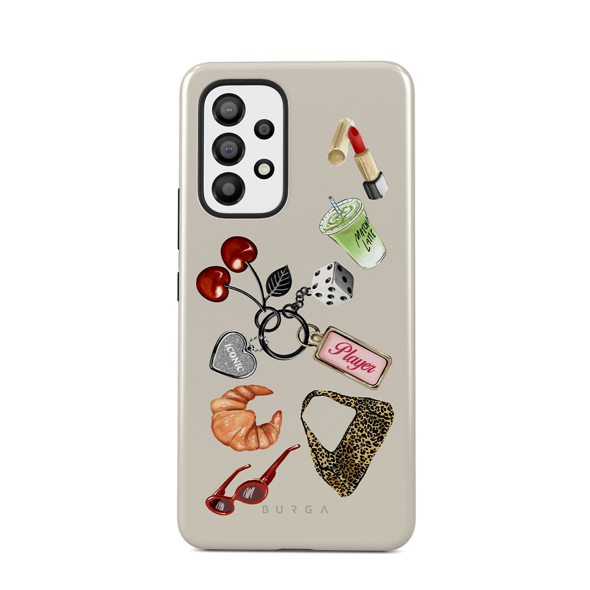 This design features: red sunglasses, red lipstick, green matcha drink, croissant, black dice, leopard-print bag, keychain with silver heart, cherries, dice and "Player" tag