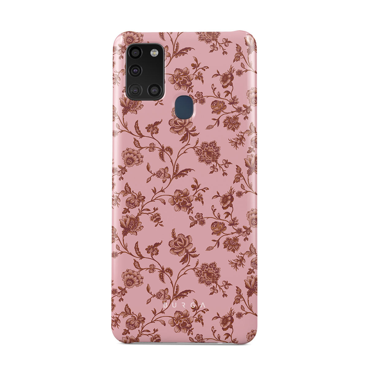 The Lover Samsung Galaxy A21s 4G phone case design: because you're a Lover, not a fighter. Delicate floral motifs across a soft pink background capture the essence of timeless beauty and rustic elegance. Perfect for modern-day cowgirls with a vintage heart.
