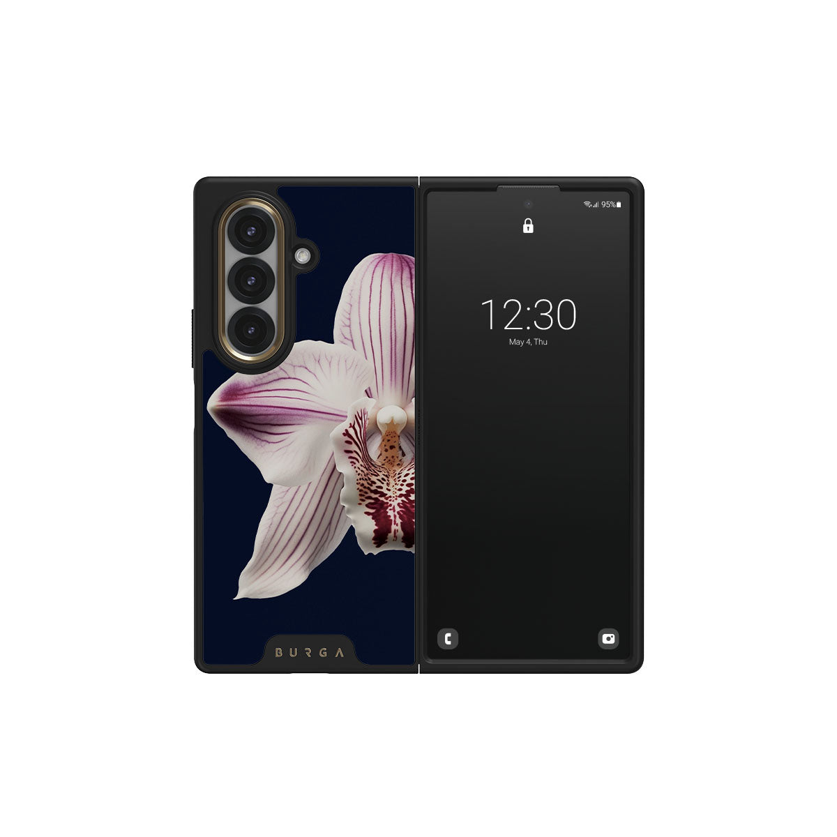 The white orchid blooms boldly upon a night sky blue, a beacon of clarity in the darkness. Our Nectar Samsung Galaxy Z Fold 7 phone case design speaks to the soul's desire to find light within, to illuminate the hidden paths of self-discovery that only reveal themselves under the cloak of introspection.