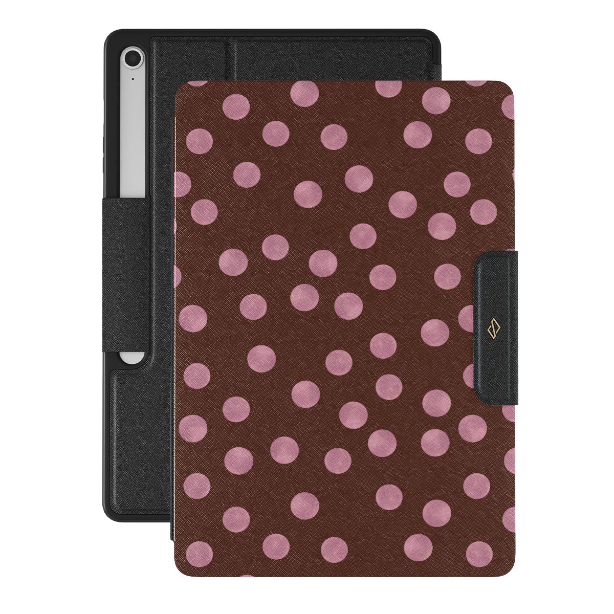 This design features: pink polka dots, brown background, dotted pattern