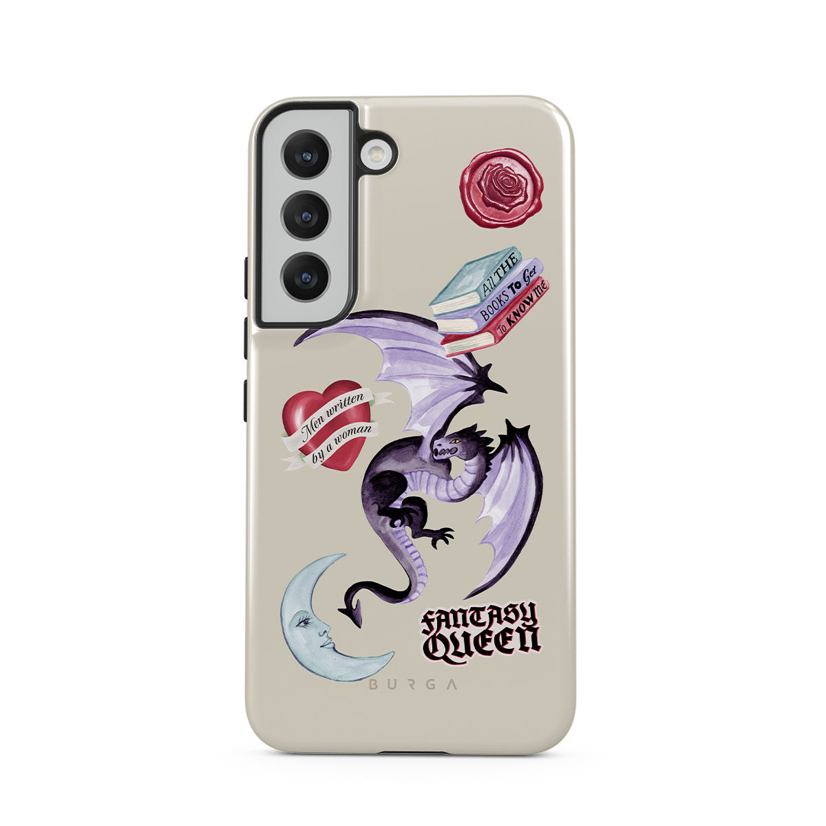 This design features: purple dragon, "Fantasy Queen" sticker, crescent moon, purple wax seal, heart with message, books