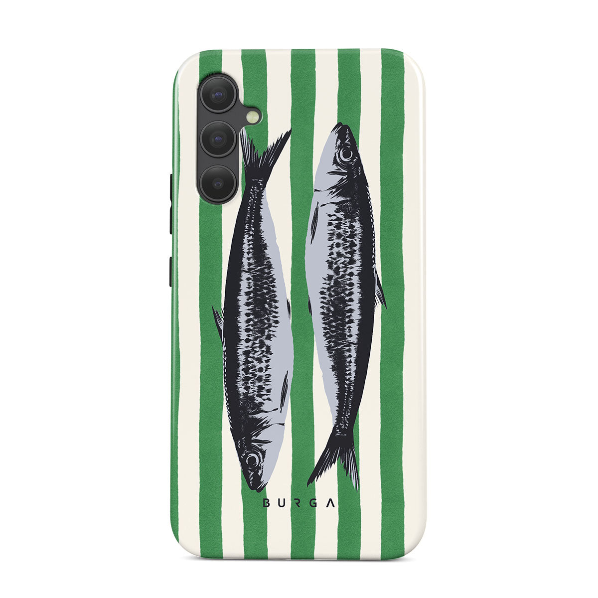 This design features: Sardines, green stripes, ocean motifs