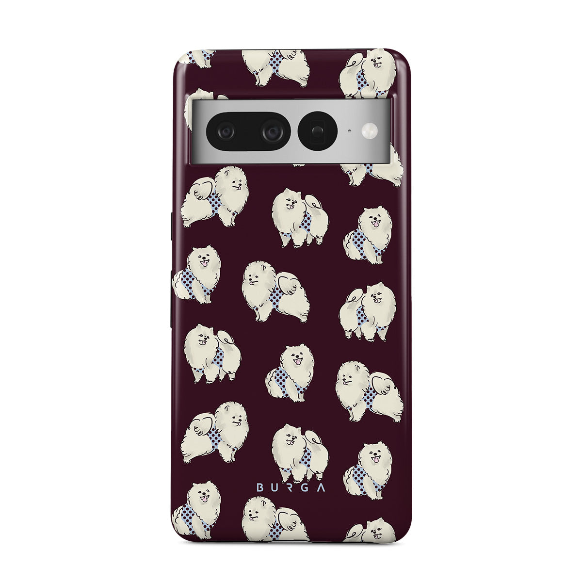 This design features: white fluffy dogs on a deep burgundy background, poodles, pets.