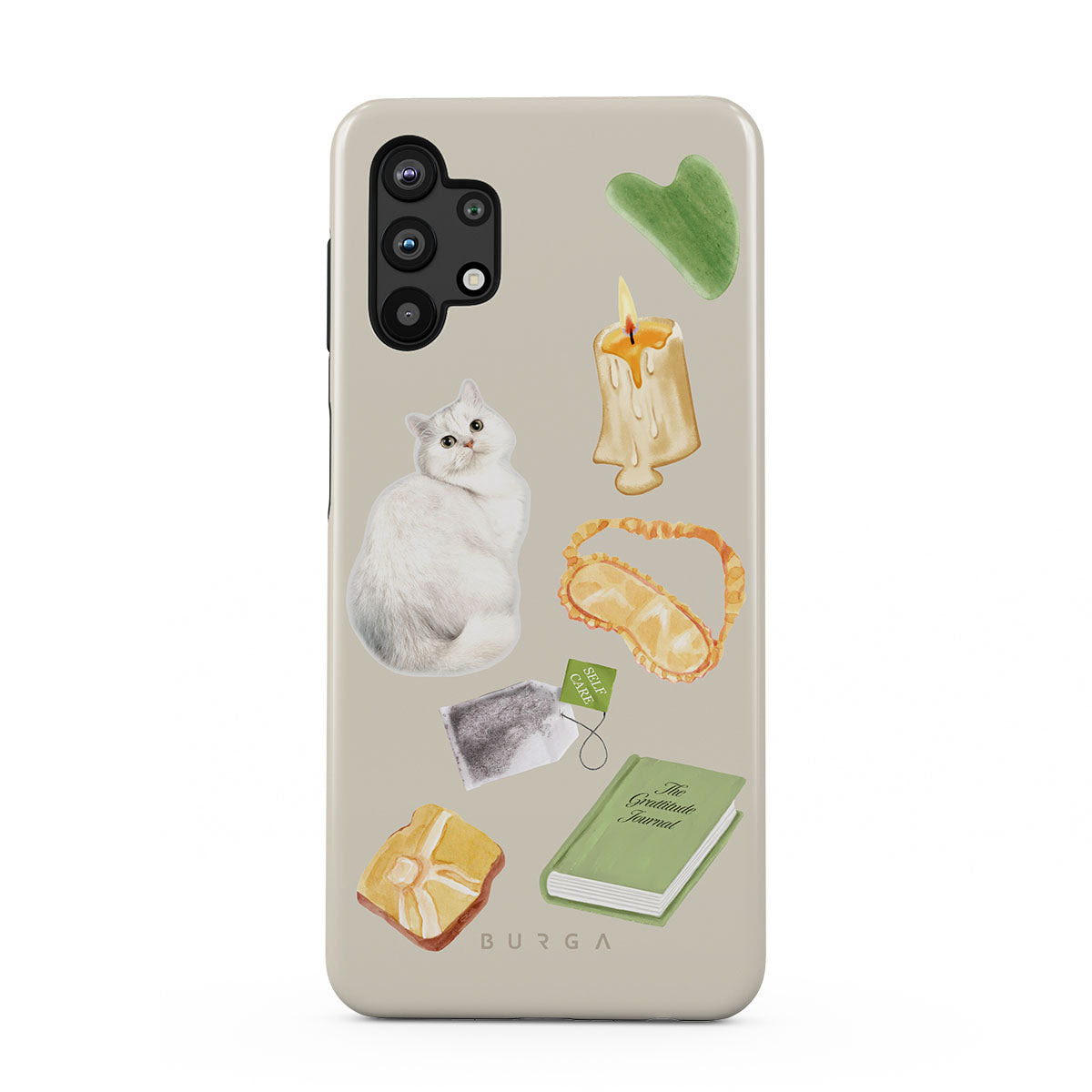 This design features: white cat, green book, candle, Gua Sha bar, sleeping mask, tea bag, yellow crystal