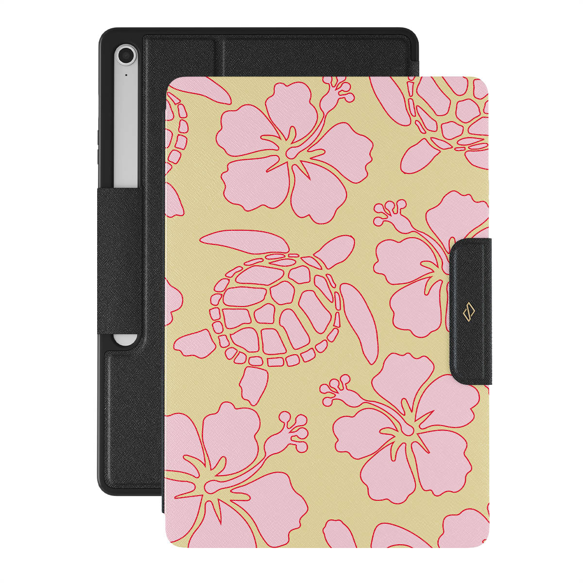 The Tan Break Samsung Galaxy Tab S10+ FE folio case features a vibrant design with pink flowers and sea turtles on a sunny yellow background. This tropical-inspired pattern exudes a laid-back, beachy vibe, perfect for those who love vibrant and nature-themed aesthetics.