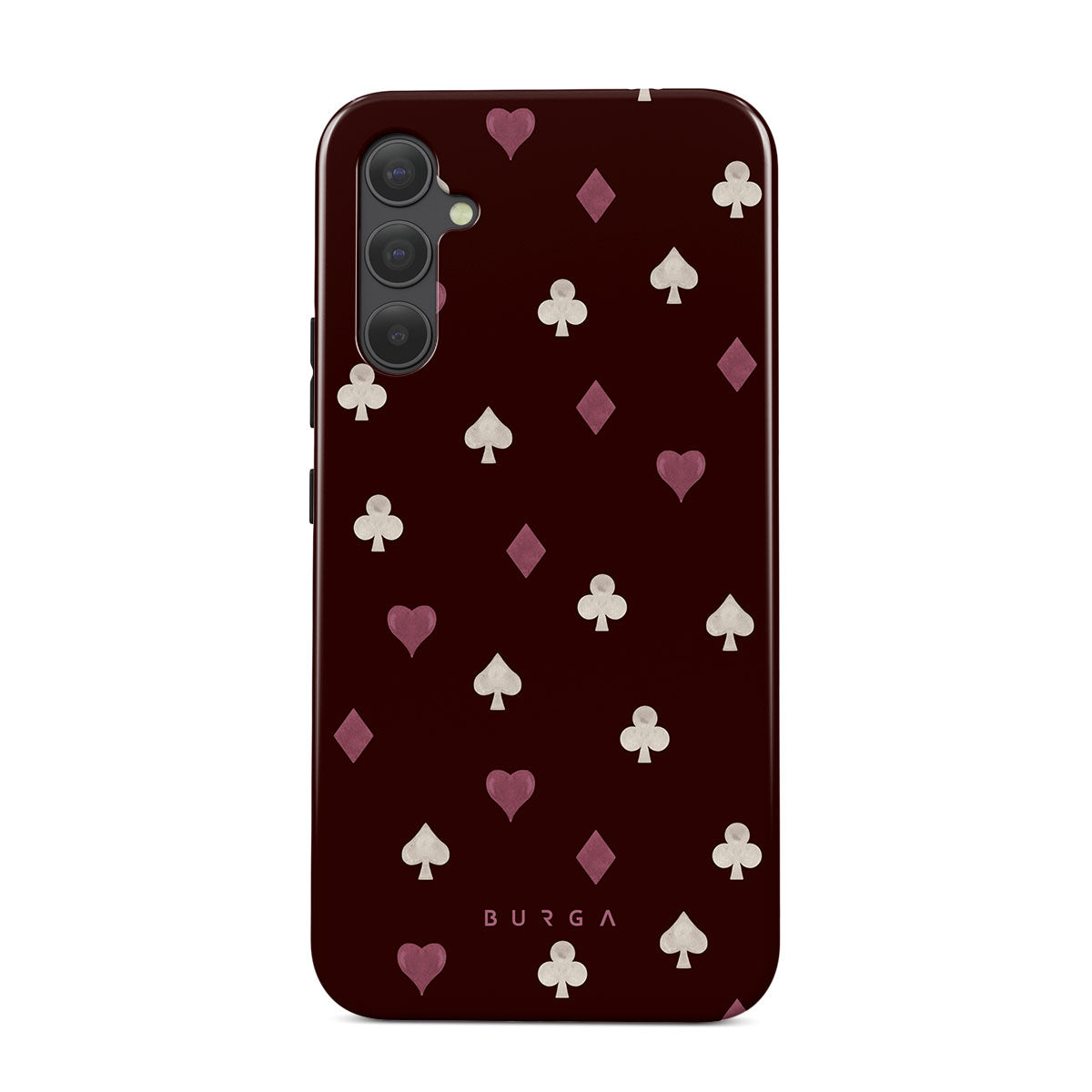 Nothing is as it appears. Hearts, clubs, diamonds, and spades—stacked in your favor or playing against you? This Samsung Galaxy A34 phone case design features a rich burgundy background and minimalist suits that make for a game where the rules are constantly shifting.
