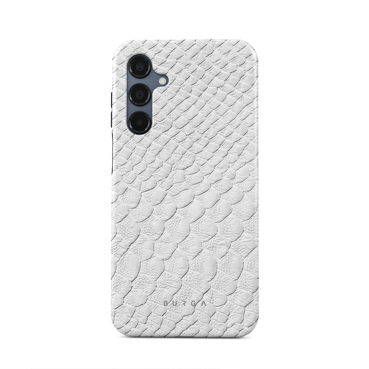 Glacial Desert Samsung Galaxy A16 phone case features snakeskin design in glacial white color. The dangerous animal print will add confidence and a touch of luxury to your style while transforming your phone into a fashion accessory.